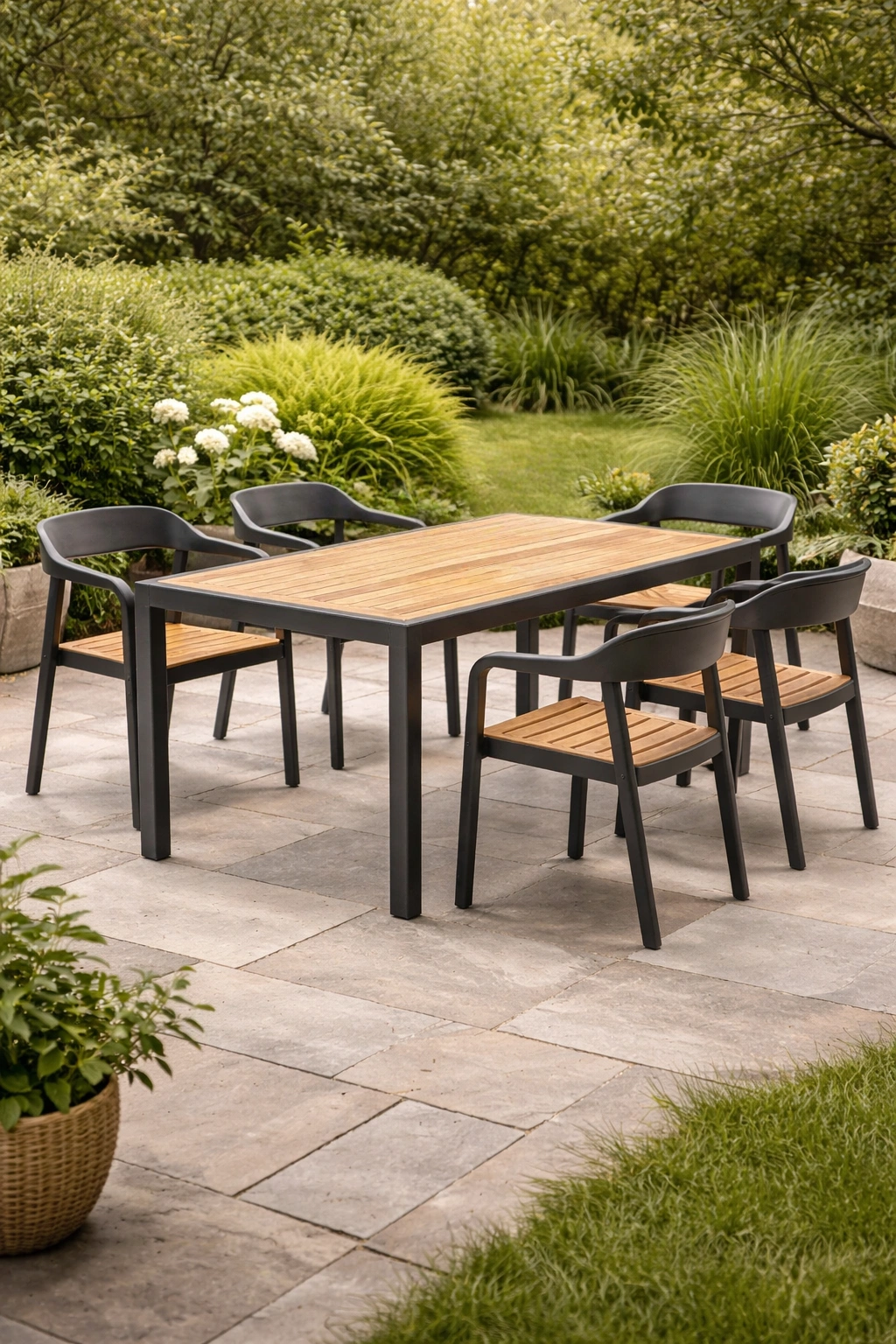 Ensemble de table et chaises en aluminium noir avec 4 chaises en corde synthétique