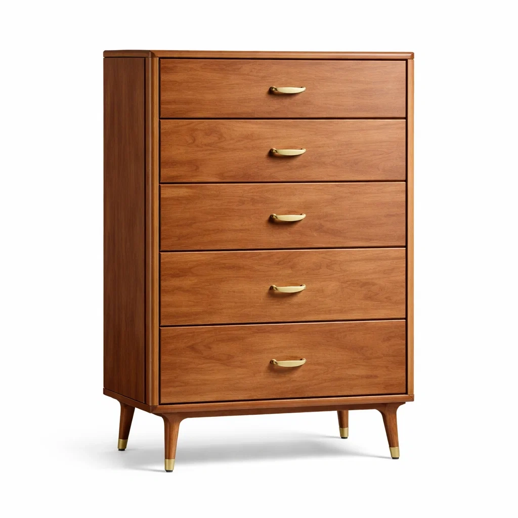 Cette commode inclut cinq tiroirs équipés de glissières métalliques.