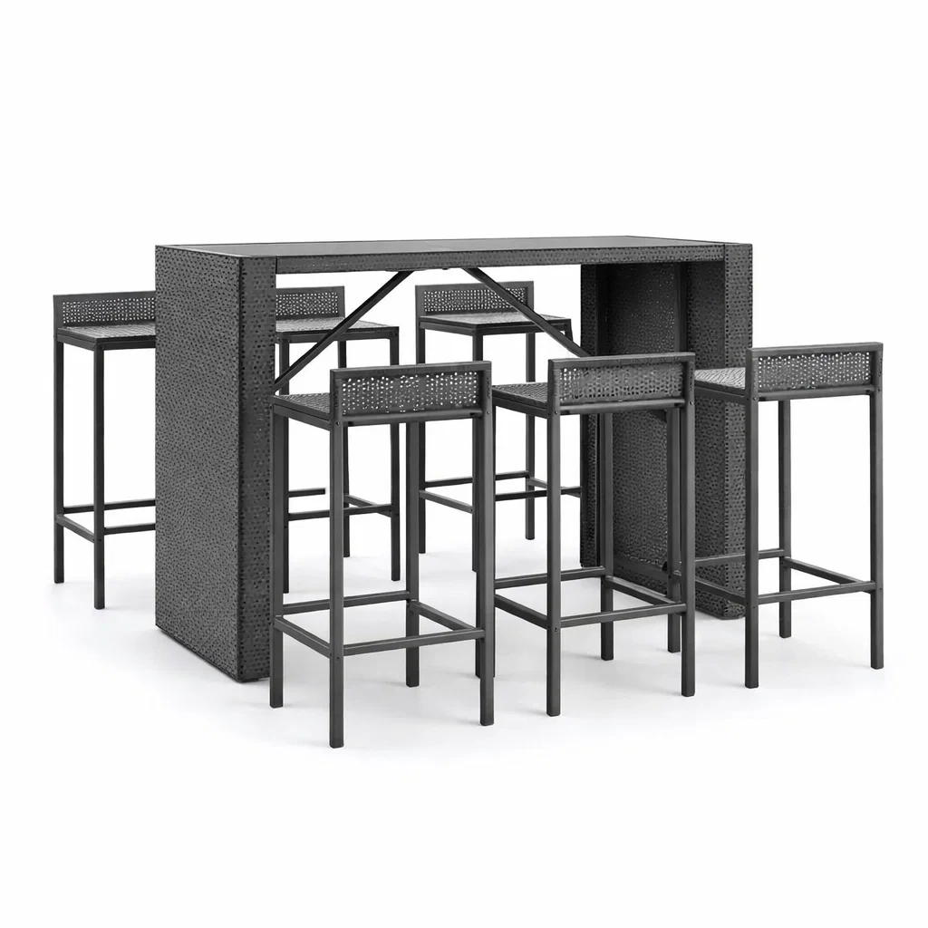 Ensemble de bar comprenant une table haute et six tabourets.